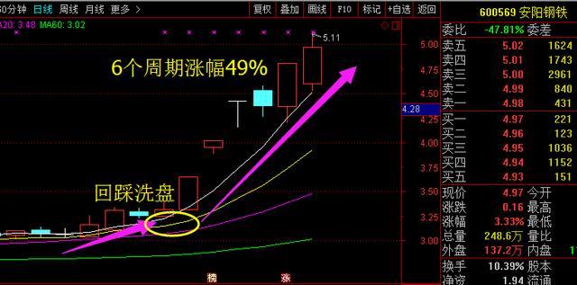 还有一只安阳钢铁600569,同样也是当时回踩洗盘的时候选出来的,在专栏上重点讲过之后,就短短6个周期涨幅达49%,也再次恭喜当时看了专栏把握到这波的朋友,这类似的股票在专栏上讲的很多,试想下如果说你也是本人专栏的粉丝,学会了这样了思,你是不是同样可以把握住,像这样走势的个股呢?