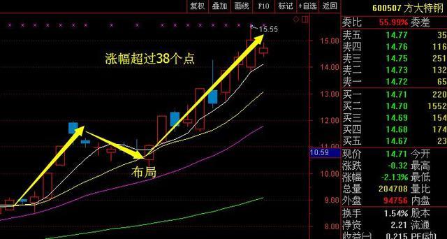 方大特钢600507的走势是典型的上升回档类的,前期经过一波拉升之后,又是一个小幅度回调,但是主力却在持续加仓,当时本人也是在专栏,回调就是布局的机会,之后股价也是一大涨,涨至高位15.55元,截止到目前为止,涨幅也是超过了38个点,相信看到并且布局的朋友,都是把握到了的。